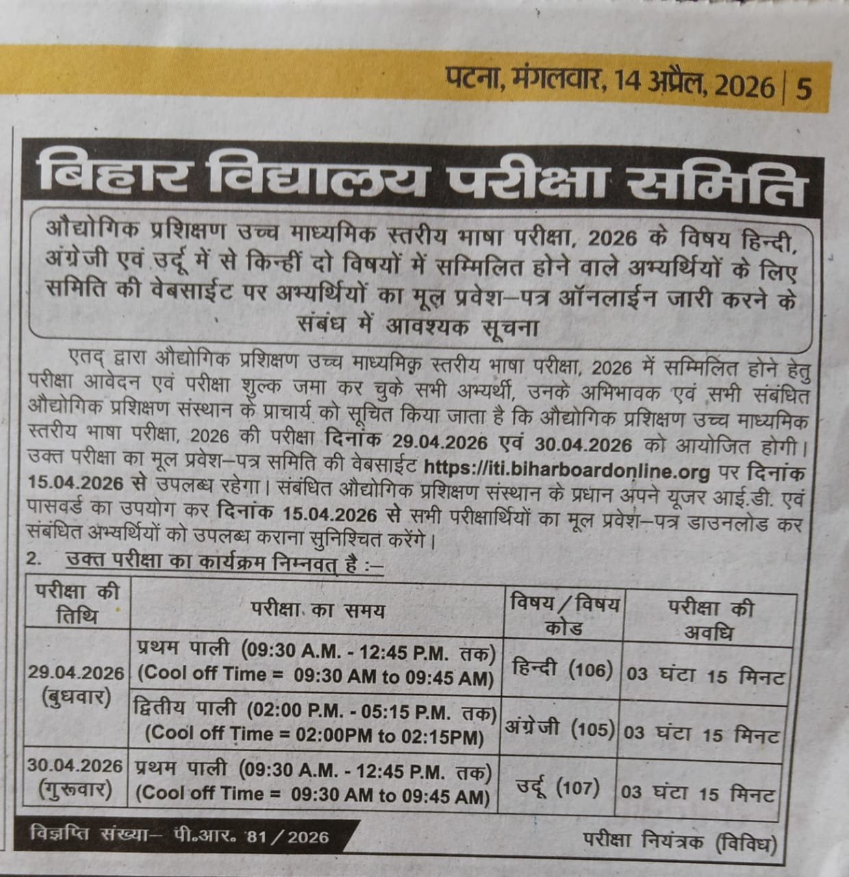 Bihar ITI Language Exam Date 2026 (Exam Routine)